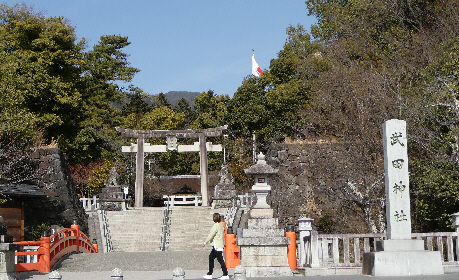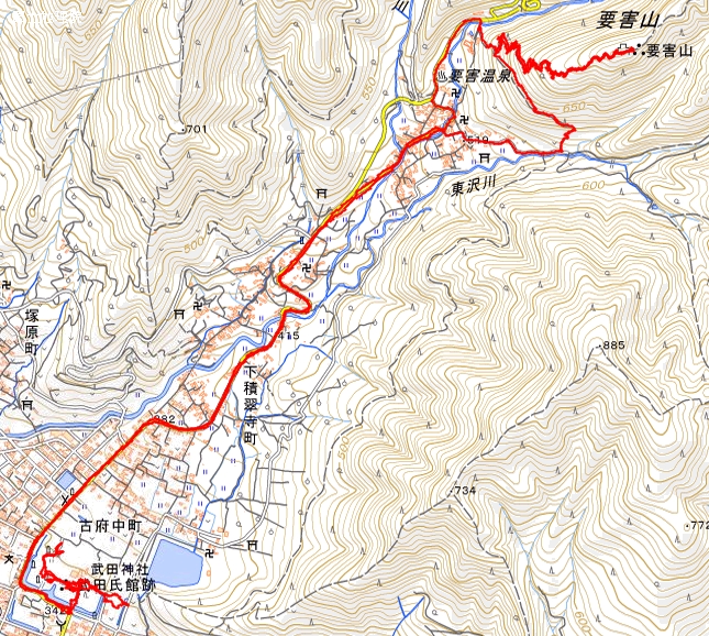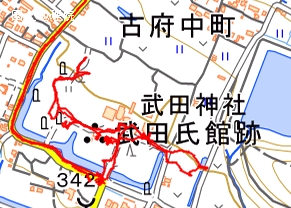 要害山登山口10:39頃、・・・35’・・要害山城11:13/11:55・・・武田神社バス停12:39頃、・・・武田氏館12:40/13:36《昼食含》・・バス停13:45、14:00-